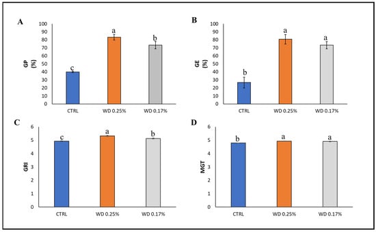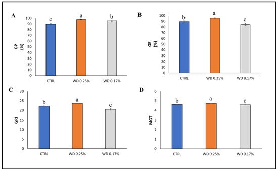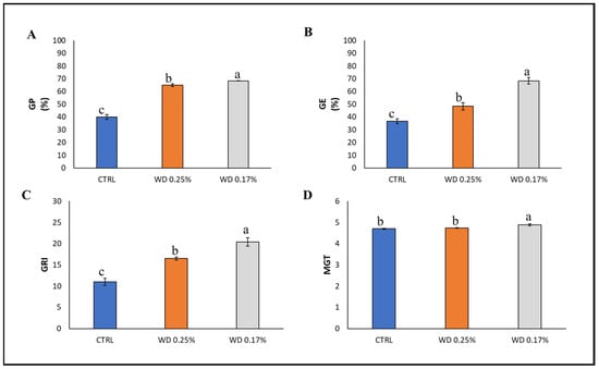 Mean ± standard deviation of Germination Percentage (GP%) (A), Germination Energy (GE%) (B), Germination Rate Index (GRI) (C), and Mean Germination Time (MGT) (D) of chickpea seeds soaked with distilled water (CTRL), 0.25% WD, and 0.17% WD; different letters indicate statistically significant differences between treatments (p < 0.05).