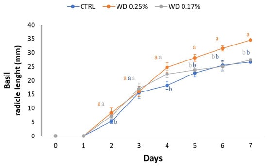 Radicle length of basil seedlings primed with water (CTRL), 0.25% WD, or 0.17% WD. The length of the radicle was measured daily for 7 days. Different letters indicate statistically significant differences between treatments (p < 0.05).