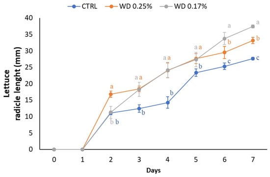 Radicle length of lettuce seedlings primed with water (CTRL), 0.25% WD, or 0.17% WD. The length of the radicle was measured daily for 7 days. Different letters indicate statistically significant differences between treatments (p < 0.05).