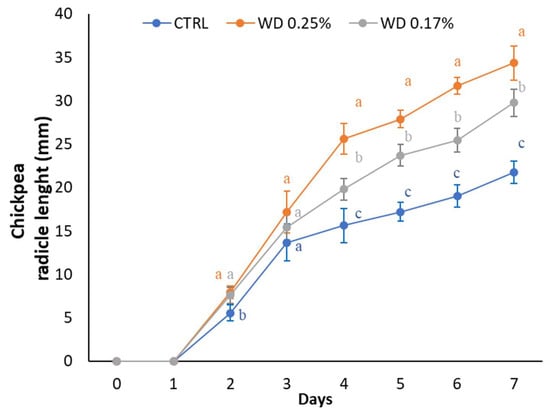Radicle length of chickpea seedlings primed with water (CTRL), 0.25% WD, or 0.17% WD. The length of the radicle was measured daily for 7 days. Different letters indicate statistically significant differences between treatments (p < 0.05).
