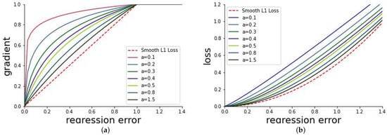 From Figure 4a, it can be seen that compared to the smooth L1 gradient function, amplifies the value of the small gradient, indicating that the network pays more attention to the regression loss of high-quality samples during training. Moreover, as the equilibrium parameter a increases, the small gradient value also increases without affecting the large gradient value part. Finally, the weight of the high-quality samples in training are increased, the gradient function is integrated, and the loss function is obtained: