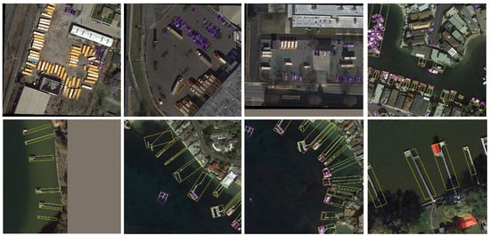 Figure 5 shows the detection performance of this method on the DOAT dataset, with the first row of images containing a large number of small targets of different categories and densely arranged. Our method can clearly detect every target, which proves that the dynamic rotation convolution proposed has good adaptability to direction, making the extracted features closely fit small targets, thereby improving the network’s detection ability for small targets. The ships, docks, and other targets in the second row of images are distributed in multiple directions, and this method can also accurately detect each target direction. This suggests that the DCM module employed in this study enhances the network’s ability to model target directional features, enabling the accurate detection of multiple targets with distinct directional disparities.