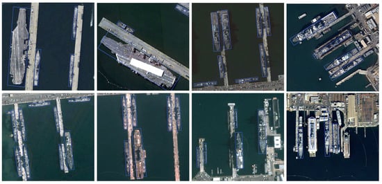 HRSC2016 [25] is a publicly available RS ship dataset, which features densely arranged and diverse directions of docked ships, with complex image backgrounds. The texture of the ship is similar to that of the shore, and there are significant differences in the scale of multiple targets in one image. This dataset consists of 1061 images, with a resolution ranging from to . For the detection accuracy of HRSC2016, we used the average precision (AP) as the evaluation standard, which is consistent with PASCAL VOC 2012.