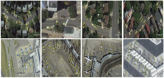 Figure 7 shows the detection results of this method on the UCAS-AOD dataset. In the first row of images, the vehicle is obstructed by trees and buildings. This network is sensitive to the features of the target spatial direction, so it can detect partially occluded targets by predicting the direction and width of vehicles. The airplane in the second row of images exhibits characteristics with different directions and a dense layout. We ensured the accuracy of model detection through balanced loss training.