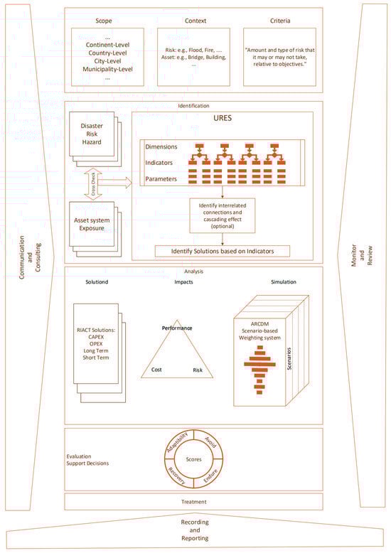 To effectively evaluate UR, a detailed process is essential, beginning with the definition of the analysis scope at various levels, from continent to municipality, as guided by ISO 31000. This approach aligns with the European legislation Council Directive 2008/114/EC, which mandates member states to identify and safeguard critical infrastructure by assessing risks. The process involves setting clear objectives, identifying risks and hazards in urban areas, and selecting relevant constructed assets for evaluation, ensuring compliance with the Directive [90]. Gathering accurate information about risks, vulnerabilities, and critical assets from various stakeholders, including city authorities, community leaders, and emergency response professionals, is a critical component of this process. To enhance the evaluation process’ effectiveness and adherence to standards, various frameworks and systems are integrated. These include IAM—The Big Picture [86] and ISO 55000 [70], which offer a comprehensive view of asset management across the entire lifecycle of assets. Additionally, the Urban Resilience Evaluation System (URES), outlined in [52], is utilized to assess urban resilience specifically in relation to the risks and hazards faced by urban areas, as discussed in Tarpani & Azapagic, 2023 [21].