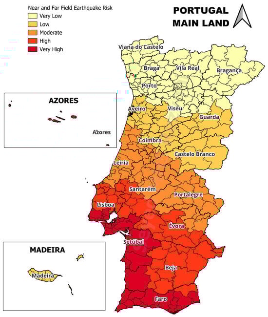- Earthquake Information: Central to our study, we gathered information on both near-field (EC2) and far-field (EC1) earthquakes [26,99]. These data provide a detailed look at Portugal’s history of seismic events. Additionally, we utilized geospatial data from the Portugal cities border shapefile, obtained from the Global Administrative Areas (GADM) database, to define geographical boundaries that are very important for our analysis;