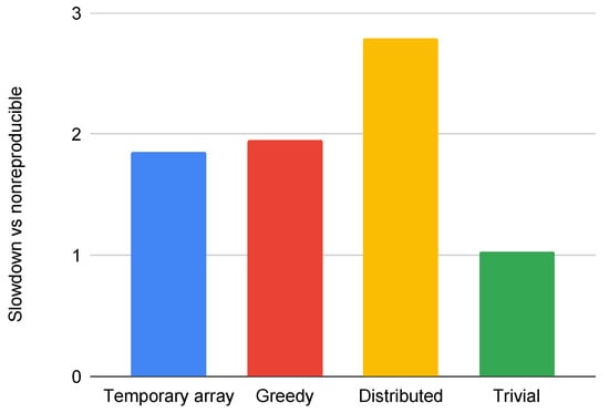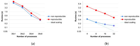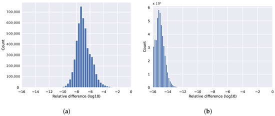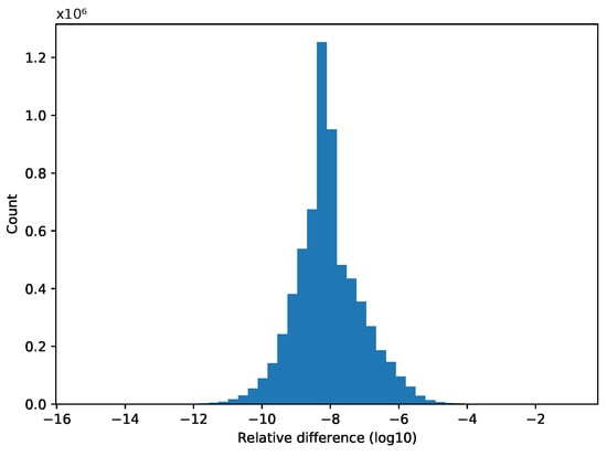 Reproducibility is often understood as experimental reproducibility. This is also a widely researched topic [31,32,33,34,35], but our aim is to obtain bitwise identical results of an application run with the same input parameters regardless of the level of parallelism, be it the number of threads or processes executed simultaneously. Non-reproducibility is not caused by the roundoff error but by the non-determinism of accumulative roundoff error. Due to the non-associativity of floating-point addition, accumulative roundoff errors depend on the order of evaluation, which is almost always relaxed in parallel and distributed environments. In a distributed MPI environment, there are multiple possible sources of non-associativity: number of MPI nodes, MPI reduction tree shape, number of cores per node, and data ordering. The histogram in Figure 1, which runs the Aero benchmark of the OP2 library, shows the relative differences () of a non-reproducible application run with different numbers of MPI processes. In general, some of the causes might be efficiently addressed, such as the reduction tree shape, which can be defined by network interface cards [36], but changing the number of processes can cause issues that are not as easily addressed. A general solution might be to fix the order of evaluation but that is, in many cases, incompatible with parallelization, and running sequentially is prohibitively costly. Another solution is to eliminate rounding errors. We can use exact arithmetics [37], but that will substantially increase the memory usage and the cost of the computations, as well as the amount of communication when applied to more complicated operations such as matrix multiplication. Higher precision can be used, but it will be reproducible only with higher probability [38].