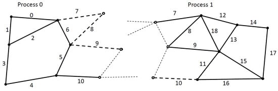 The distributed and parallel execution of unstructured mesh algorithms is a well-established field [42,43,44,45]. For distributed memory execution, the mesh is partitioned using one of many established libraries, such as PT-Scotch or ParMetis [46,47]. It is important to note here that an unstructured mesh is a hypergraph, consisting of multiple “vertex” types, whereas most partitioners only partition a simple graph, and the rest of the hypergraph is usually partitioned in a greedy way through connections to the simple graph. This is then related to how computations are executed, an “owner-compute” approach is commonly utilized, where all computations associated with a given element are performed on the process that owns that element. So, for instance, in the earlier example, the process that owns a given cell will execute all the edges that increment that cell, even if some of those edges are not owned by it. This requires communicating all the data needed to execute those edges as well. This often leads to redundant computations around partition boundaries. Depending on the exact implementation the deterministic order of execution for elements is often relaxed at this point to allow shared memory parallelization and powerful optimizations such as overlapping computations and communications.