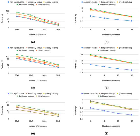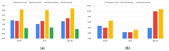 The runtime overhead of the preprocessing preparations of the temporary array and coloring methods against the number of MPI processes are detailed in Figure 9 and using only one process in Table 4.