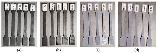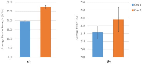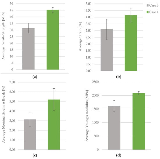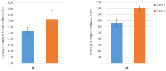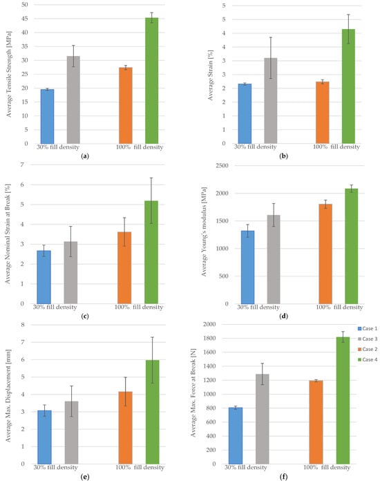 The mechanical parameters of ABS 3D-printed specimens using FDM were tested under tensile loading conditions at two different infill densities: 30% (Case 1) and 100% (Case 2): (a) average tensile strength, (b) average strain, (c) average nominal strain at break, (d) average Young’s modulus.