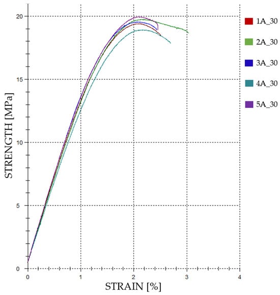 The graphical presentations of the tensile strength and strain for individual FDM 3D-printed ABS tensile-tested specimens are shown in Figure 4 and Figure 5.