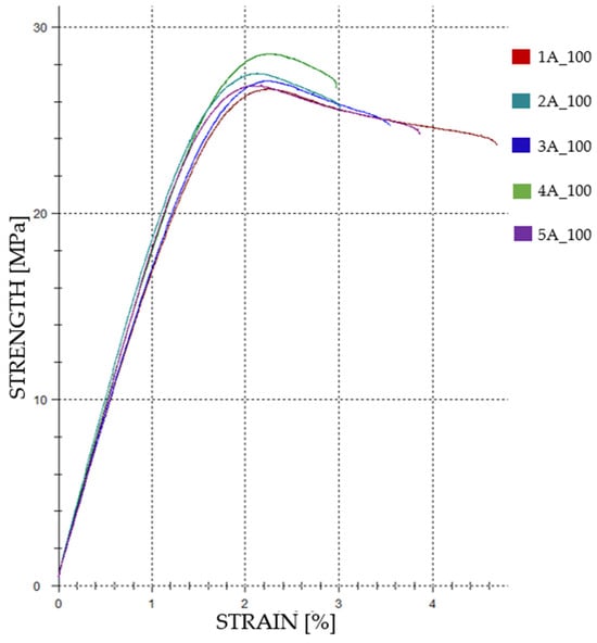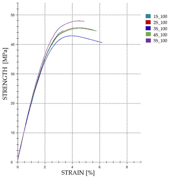 Figure 4 illustrates the graphical representation of the tensile test outcomes for FDM 3D-printed ABS samples with a 30% fill density (referred to as Case 1), whereas Figure 5 shows the results of tensile tests for ABS samples with a 100% fill density (identified as Case 2).