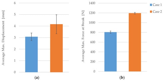 The calculated average value of mechanical parameters for FDM 3D-printed ABS tensile-tested specimens: (a) average maximal displacement and (b) average maximal force at break.