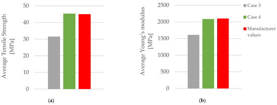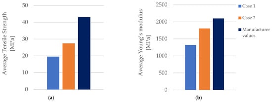 Comparison of the tensile strength and Young’s modulus of the SLA 3D-printed ABS-like tensile-tested specimens with those of the resin (manufacturer values): (a) average tensile strength, (b) average Young’s modulus.