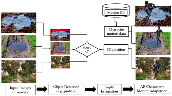 Figure 3 describes our automatic motion adaptation process for the AR character in real environments. To adjust the motion to match the real situation, first, we needed to predict the objects in the real world using a detection process. At this time, if the score of the detected object was higher than the pre-defined threshold (T) related to object recognition, we decided that adaptive motion should be applied to the AR environment instead of the character’s original motion. Here, the threshold value, which is related to the degree of performance of object recognition, required to determine the character’s motion will be set depending on environmental conditions such as lighting conditions. Then, we applied this to the corresponding character motion by considering the location of the actual detected object and its characteristics. We then estimated the 3D position from 2D images (or moving pictures) to determine the location where the virtual character should be superimposed. For example, the AR character with original movements (e.g., normal walking movement) will generate suitable motion sequences (e.g., careful walking movement) at the location of the recognized object. As shown in Figure 3, we recognized real objects, such as puddles, from a large number of real images and selected the character’s motion expressed to match the real-world context from several motion candidates. Detailed information is provided in the Section 4.