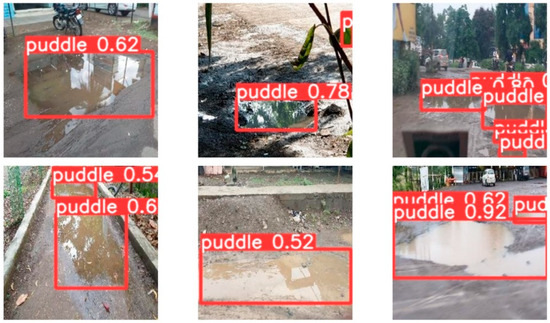 Puddle objects detected in real-life images. The letters represent the recognized objects, and the numbers show the confidence level of the results. Here, the object recognition results are expressed based on a sliding window, so the results are displayed overlapping.