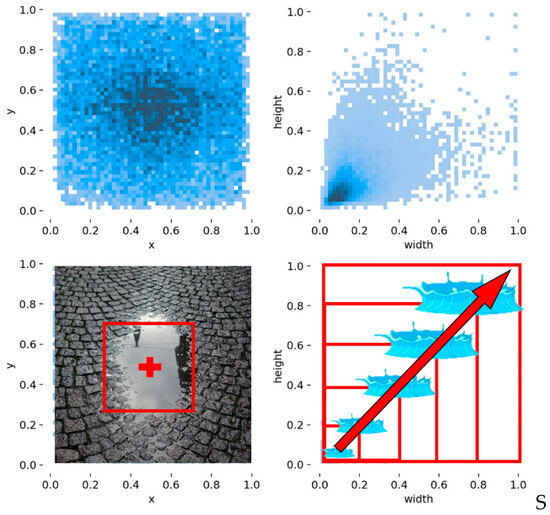 Quantitative accuracy of object detection to evaluate performance in a real-world situation using puddles as examples. These results were probabilistic recognition performance. The top-left side of the figure shows the performance for the location in the given image, and the top-right side shows the performance related to the size of the target object. Here, darker colors indicate more accurate results. The bottom-left figure shows the x and y position marked in red of a real image, and the bottom-right figure shows an example for understanding the size of the width and height. The results show that the objects had the highest scores when they were located between 0.4 and 0.6 in the image; in the case of the size, the best results were between 0.05 and 0.15. Here, numbers for experimental results represent relative normalized values.