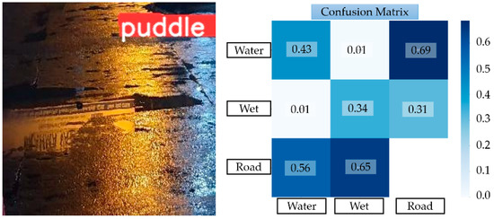 Example of our results related to detection errors. The figure shows that an error occurred due to light reflection (left). The right side shows a confusion matrix of our overall performance, where darker colors indicate higher values. For example, the error probability of recognizing the wet ground in the image as an ordinary road was found to be 65% (see the block in the bottom middle of the right image).