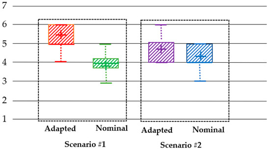 Survey results regarding participants’ experience of co-presence: adapted motion versus motion without adaptation (or nominal/original motion). Here, scenario #1 involved a puddle, and scenario #2 was performed in a muddy situation.