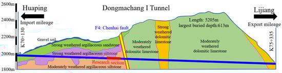 Dongmachang No. 1 Tunnel (Figure 1) is a control project of the Huaping-Lijiang Expressway. The starting point mileage of the tunnel is ZK70 + 130, and the stopping point mileage is ZK75 + 335. The total length of the tunnel is 5205 m, and the maximum buried depth is 613 m. The elevation of the tunnel area is 1870~2512 m, and the relative height difference is 643 m. The terrain is rugged, and many bedrocks are exposed, and the soft rock accounts for a large proportion. The tunnel intersects the Chenghai-Binchuan active fault zone at K72 + 164, which is a Holocene active fault. The width of the fault zone is about 95 m. The fault occurrence is 310°∠72°, and the angle with the tunnel is 41°, which belongs to the compressive reverse fault. Affected by the fracture, the lithology of the tunnel entrance section and the exit section is quite different. The entrance section is dominated by argillaceous siltstone, and the exit section is dominated by dolomite limestone.