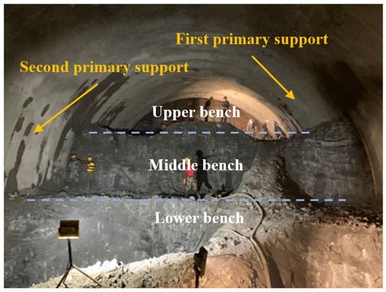 The stress release is closely related to the excavation method of the tunnel, and the order and method of tunnel excavation are two of the key factors that control the deformation of the surrounding rock. Choosing the appropriate excavation method can control the large deformation of soft rock to a certain extent [13], which has important engineering significance. At present, the excavation of soft rock tunnels mainly adopts the step method or other partial excavation methods [14,15]. The construction method of partial excavation can ensure the stability of the surrounding rock and supporting structure in the construction process, but at the same time, there are a series of problems, such as complicated processes, mutual interference, and insufficient construction space, and the construction efficiency is relatively low. With the innovation of tunnel design concepts and construction technology, the full-face excavation method has been widely used because of its advantages of fewer process connections, relatively large working spaces, and high construction efficiency. The cases of this method applied to soft rock tunnels are also increasing [16,17,18]. Enlarging the tunnel excavation face to the full section can provide sufficient working space for mechanical equipment and simplify the process, but the self-stability of the tunnel face is reduced, and the construction risk is increased.