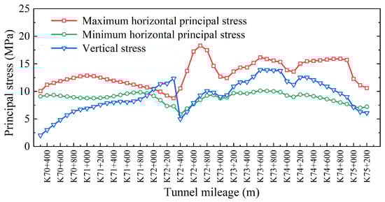 Kou et al. [25] used the hydraulic fracturing method to monitor the in situ stress and established a three-dimensional finite element model. The least squares method was used for regression inversion to obtain the in situ stress value of the rock mass in the whole area. The in situ stress inversion results along the tunnel are shown in Figure 4. Combined with the relevant in situ stress test and inversion results, it can be seen that the stress state of the stratum in the selected typical section is complex. Taking section K71 + 882 of the tunnel entrance section as an example, the in situ stress inversion results are shown in Table 1, and the tunnel passing through it is affected by the large horizontal tectonic stress.