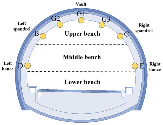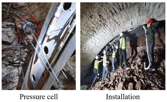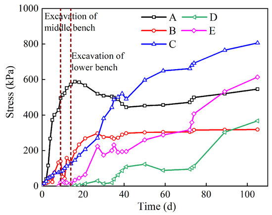 In order to study the stress release of the tunnel site, the K71 + 882 section of the entrance section of the Dongmachang I tunnel was selected as a typical monitoring section. After the tunnel was excavated and the steel arch was arranged, the pressure cell was installed between the primary support and the surrounding rock to monitor the contact pressure, as shown in Figure 10. The contact stress between the initial support and the surrounding rock at the tunnel vault (A), left and right arch shoulder (B, C), and left and right arch waist (D, E) during the construction period was monitored, respectively. The layout of the monitoring points is shown in Figure 11.