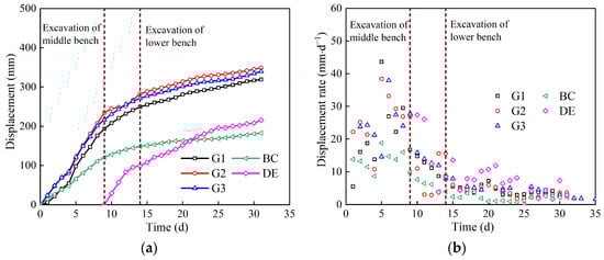 Monitoring data of K71 + 882: (a) Displacement; (b) displacement rate.