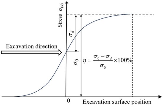 The displacement release of the tunnel is accompanied by stress release. When the excavation face is a certain distance away from an unexcavated section, the stress redistribution begins to occur in the target section. The constraint stress generated by the surrounding rock on the proposed excavation boundary of the section is defined as the initial stress. With the continuous advancement of the excavation face, the constraints on the excavation boundary of the section are continuously reduced until the tunnel face passes through the section and has a certain distance. The constraint is reduced to 0, which is the stress release process accompanied by tunnel excavation. The relationship between the stress release and the position of the excavation face is shown in Figure 9. σ(x) is the constraint stress release value corresponding to the target section when the excavation face is at any position. The definition of the stress release rate at any point around the tunnel can be obtained by the ratio of the reduction in the constraint stress to the initial stress. The stress release rate is deduced as follows [27]: