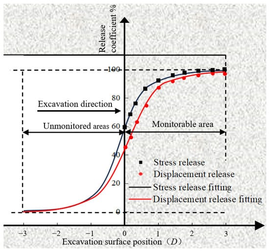Combined with the field-measured data fitting results, as shown in Figure 13, the relationship curve between the release coefficient and the position of the excavation surface is obtained. It can be seen that the stress release coefficient curve is close to the displacement release coefficient curve, which can be approximated as the displacement release rate will increase linearly with the increase in the stress release rate.