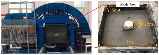 The above studies have beneficially verified the strong correlation between stress release rate and displacement release rate. In order to further explore the displacement deformation and mechanical characteristics of surrounding rock under different excavation methods of soft rock tunnels with high ground stress, this paper uses a model test to carry out further research. The traditional model test often uses the model box to realize the in-situ stress loading through the loading system and excavates the model soil according to demand to simulate the actual tunnel excavation [28,33,34]. This test method can better restore the construction process of the tunnel, but there are still some shortcomings. For example, due to the limitation of site and cost, the traditional model box test usually uses a small-size model to simplify the simulation of the actual tunnel project (Figure 14), which will lead to the inability to accurately restore the three-dimensional effects in the actual project, such as the non-uniformity of the stratum, the complex boundary constraints, and the neglect of the deformation and stress transfer of the vertical direction model soil, which ultimately leads to the inability to reflect the real complex actual project.