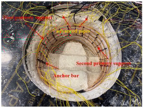 The stress state of the anchor bar is similar to that of the advanced pipes, and the load is mainly bending. In this experiment, a high-density polyethylene rod (HDPE) was selected to simulate the bolt. Firstly, the moment of inertia of the HDPE rod was calculated according to the similarity relationship of Equation (4), and then the HDPE rod with the appropriate diameter was selected according to the moment of inertia. In practical engineering, the anchor rod has a variety of different sizes, mainly including a 4 m short anchor rod, 6 m short anchor rod, and 9 m long anchor rod. According to the similarity ratio, the HDPE rod is cut into lengths of 0.08, 0.12, and 0.18 m. The material parameters of the anchor bolt are shown in Table 6, and the actual similarity ratio is close to the theoretical similarity ratio.