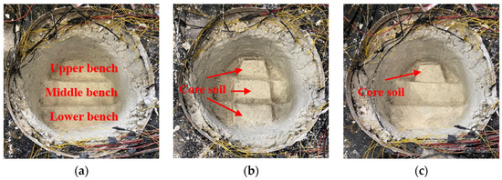 Tunnel model excavation method: (a) Three-bench; (b) three-bench with reserved core soil; (c) three-bench seven-step.