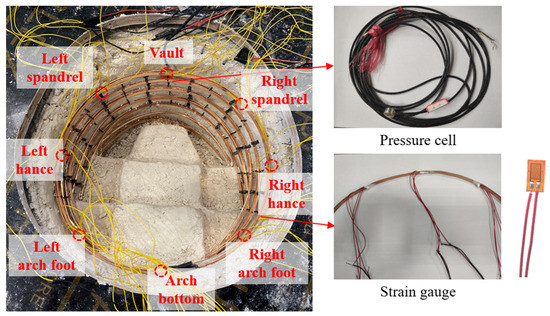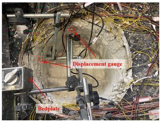 The monitoring system includes displacement monitoring and stress-strain monitoring, and it carries out multi-information monitoring and collection of the surrounding rock displacement deformation and stress evolution process during tunnel excavation. The vertical displacement and horizontal displacement of the tunnel are monitored by the monitoring surface near the lower step. The displacement monitoring device is composed of the base and the displacement meter (Figure 19). The earth pressure box is used to monitor the boundary load of surrounding rock and the contact pressure of the steel arch. Eight monitoring points are selected for the monitoring section, which includes the vault, left spandrel, right spandrel, left arch waist, right arch waist, left arch foot, right arch foot, and inverted arch (Figure 20). The surrounding rock pressure is measured using a miniature earth pressure cell arranged between the surrounding rock and the steel arch. Strain gauges are pasted between the first main support and the surrounding rock and between the first main support and the second main support to monitor the contact pressure between the tunnel’s surrounding rock pressure and the initial support. During the test, the strain on both sides of the copper sheet is monitored by the strain gauge, and the internal force of the steel arch is calculated to explore the differences caused by different excavation methods.