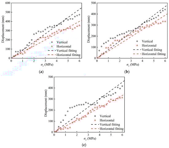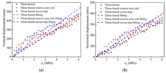 In order to explore the deformation characteristics of soft rock tunnels under different excavation methods and to make the results more intuitive, this paper converts the tunnel deformation results monitored by the displacement meter according to the length similarity ratio. We obtained the vertical and horizontal directions under different construction methods. The displacement diagram of the load change is also shown (Figure 22). It can be seen that under different excavation methods, the variation law of the displacement around the tunnel is close, which shows that the displacement around the tunnel gradually increases with the increase in load. The deformation around the tunnel is mainly vertical displacement, and the vertical displacement is 5.3~106.4% larger than the horizontal displacement. The confining pressure loading corresponds to the gradual increase in the stress release rate from 0. Combined with Figure 22, it can be seen that there is a certain linear relationship between the displacement of the tunnel and the applied load. The relationship between the two is highly fitted with the straight line, which further verifies the assumption that the displacement release rate is approximately equal to the stress release rate.