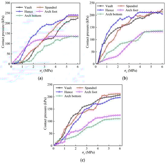 Contact pressure of the second primary support with different excavation methods: (a) Three-bench; (b) three-bench reserve core soil; (c) three-bench seven-step.