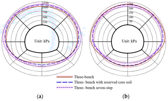 From the comparison diagram of contact pressure, it can be seen that the distribution shape of the surrounding rock pressure under different excavation methods is relatively close. The pressure is mainly concentrated in the arch shoulder and arch waist, and the pressure at the arch foot and arch bottom is small. The first layer of the initial support of the three-bench method, the three-bench core soil, and the three-bench seven-step method all reached the maximum pressure at the arch shoulder, which were 1163.17 kPa, 1223.95 kPa, and 1262.93 kPa, respectively. The maximum pressure of the primary support of the second layer is distributed at the spandrel and haunch. The three excavation methods are 248.52 kPa, 222.96 kPa, and 216.83 kPa, respectively. It can be seen that the three-bench core soil method and the three-bench seven-step method are more complicated due to their processes. The stress release is more sufficient during the tunnel excavation process. The primary support structure of the first layer bears a greater load, while the load borne by the primary support of the second layer is reduced by 10.28% and 12.75%, respectively, compared with the three-bench method.