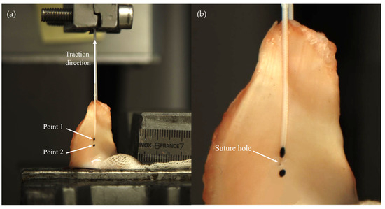 A single-axis testing machine (Figure 1), specially designed for biomechanical tests [46], was used to subject the sutured meniscus to a load-to-failure test. Three orthogonal axes are defined in the testing machine, with the z-axis coinciding with the servomotor screw that sets the direction of traction (Figure 1). The suture–meniscus set was placed in the testing machine in two phases. First, the meniscus was fixed with a clamp at approximately 8 mm from the suture point, using sandpaper surrounding the clamping area to increase friction. The meniscus was carefully oriented with the cranial surface facing the outer side of the testing machine, the longitudinal fibers of the horn were aligned to the loading direction, and the suture hole was centered with the actuator head in the loading direction. Second, the two free ends of the suture were also wrapped in sandpaper and attached to a mechanical clamp on the machine head, with 55 mm between the puncture point and the limit of the clamp when the suture is pulled manually, with just enough traction to keep it vertical. Fifty-five millimeters were selected as representative of the expected suture length in a transtibial meniscal horn repair [14,47]. An electronic inclinometer (Bubble Level 3D, v. 2.2.4, Maleirbag, 2022, Puebla, Mexico, installed on the smartphone M2002F4LG, Xiaomi, Beijing, China) was used to orient the meniscus so that its cranial and caudal surfaces were within the plane defined by the z-axis (traction direction) and the y-axis (transverse direction) of the testing machine as close as possible. Once the meniscus–suture set had been placed on the testing machine, two ink points were marked with a surgical pen on the cranial side. Aided by the inclinometer to identify the direction of traction on the meniscal surface, the points were located along a line in that direction passing through the suture hole: Point1 on the suture limb coincident with the meniscus–suture interface; and Point2 on the opposite side of the hole in its immediate surroundings (Figure 2). These marks were used for videogrammetric analysis of the displacements around the hole in the direction of traction.