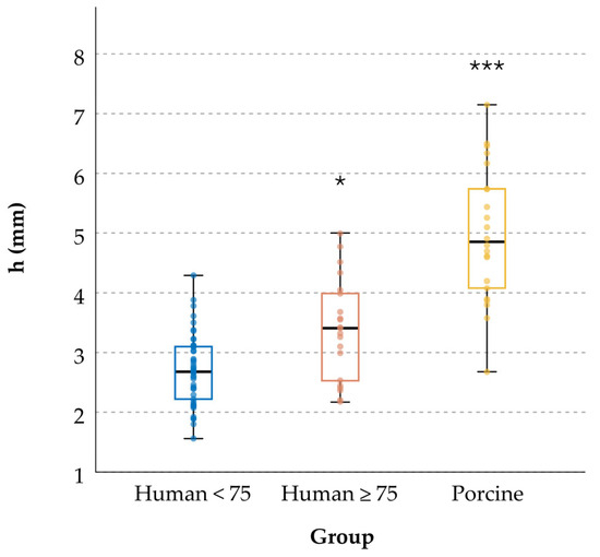 Box plot showing the meniscal horn thickness at the sutured area, , for the test groups. Each box represents the interquartile range (IQR) of the respective group, i.e., the 25–75% percentile, with the central horizontal line indicating the median value. The upper and lower limits of the vertical line correspond to the maximum and minimum values excluding outliers, i.e., the points outside 1.5 times the IQR. Dots represent all data points. Significant difference compared to human <75 years are indicated as * p < 0.05; *** p < 0.001.