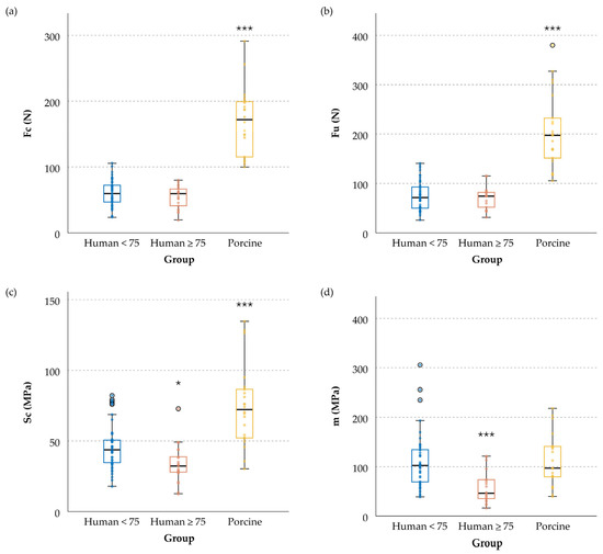 Box plots of the test groups showing (a) specimen cut-out force, ; (b) specimen ultimate force, ; (c) tissue cut-out resistance, ; (d) tissue equivalent stiffness modulus, . For each group, the box represents the interquartile range (IQR) of the respective group, i.e., 25–75% percentile, with the central horizontal line indicating the median value. The upper and lower limits of the vertical line correspond to the maximum and minimum values excluding outliers, i.e., the points outside 1.5 times the IQR. Small circles correspond to outliers, if found. Dots represent all data points. Significant difference compared to human <75 years are indicated as * p < 0.05; *** p < 0.001.