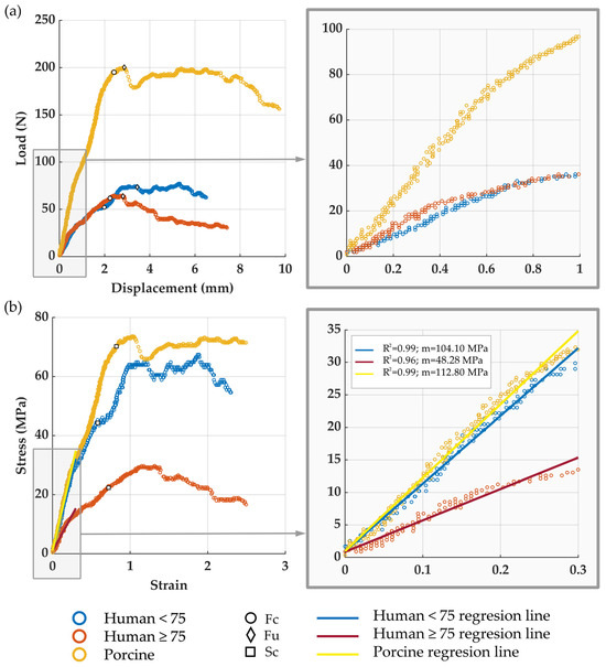 Figure 5a illustrates typical load–displacement curves for each of the sample types included in the study. Figure 5b displays the corresponding stress–strain curves for these representative samples, along with their linear adjustments in the strain interval [0, 0.3], and indicates the adjusted R-squared values of the fittings. Similar to the curves in Figure 5b, all meniscal horns showed highly linear behavior in the strain range [0, 0.3]. Specifically, the adjusted R-squared values for the linear fitting were within the range [0.91, 0.99] for human <75 and human ≥75 models, and in the range [0.92, 0.99] for the porcine model. As justified in the Materials and Methods section, the equivalent stiffness modulus, m, was computed as the slope of the aforementioned linear adjustments, resulting in the mean values in Table 2d.
