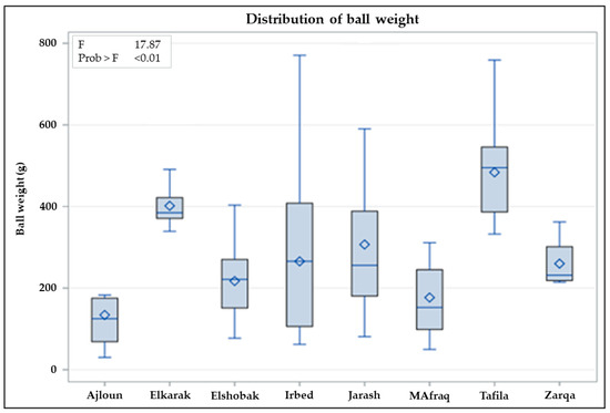 The weight of Jameed balls differed among regions. In general, Jameed is processed in big balls in the southern part of the country, e.g., Tafila and El-Karak regions. However, some producers in Irbed, northern Jordan, also produce Jameed in big balls that can reach up to 700 g (Figure 1). However, some producers produce Jameed in small balls that have a weight of around 50 g, like in Ajloun. Moreover, within regions, there are large variations in ball size (Figure 1).