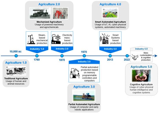 Considering the importance of the agricultural production system as a main pillar of the primary sector of industry, various scientific and technological approaches have been devised and implemented over time to increase the efficiency of their outputs [6]. Indeed, the agricultural sector has evolved throughout history, alongside the technological developments of all industrial revolutions, as illustrated in Figure 1, from the first agricultural revolution under the term “Agriculture 1.0” to the current agricultural revolution, attributed as “Agriculture 5.0” [5,7], which represents the emerging trend that the agricultural sector is going to adopt in the upcoming years. In particular, the concept of Agriculture 5.0 focuses on transforming agricultural production systems through the integration of the recent advancements in smart technologies [8] so as to enhance their efficiency while making them environmentally sustainable [9].