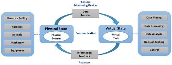 To this end, when integrating the DTs concept in livestock farming, the physical state accounts for a physical system that embodies the composite and dynamic environment of livestock facilities, with the boundaries of the DTs specified [49]. Herein, it has to be noted that the physical system is a fundamental component of a DT since the lack of it implies that the physical state merely represents a model [50]. To this end, the physical system involves the fundamental features of the incorporated physical objects and devices [51]; it can be comprised of an entire object with individual components found in a physical environment, a single component of the object [50], or an individual property of the object that is linked to other objects. In the case of livestock production systems, the physical system may indicatively consist of an entire facility, including animals, holdings, machinery, equipment, and feeding strategies, as well as a number of animals or just an animal body [52]. Finally, monitoring and sensing devices [53] are incorporated into the physical system so as to collect the data required. Accordingly, the virtual state accounts as a representation of the physical state model and data. By involving data mining, processing, and analytics by means of AI and ML techniques, the virtual state provides feedback for supporting decision-making and controlling the physical system so as to foresee any obscure matters and optimize its operation [54]. Finally, the twinning, which enables the interconnection between the physical and virtual state, accounts for the transmission of data from the physical system to its virtual twin, as well as for the reverse information feedback [55] to the livestock production system. The type of techniques incorporated for establishing such interconnection depends on the data volume, type, and source as well as the speed and rate that is required for achieving the minimum accepted delay both of the data transmission and information feedback [52,56]. Based on the aforementioned, Figure 2 has been elaborated upon, resulting in Figure 3, which depicts a schematic of the DTs concept in livestock farming.