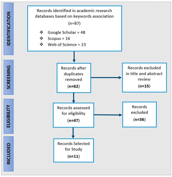- Contributions Selection. At first, contributions were selected based merely on the digital twins topic, resulting in 334 papers, among which 114 were indexed in Google Scholar, 94 in Scopus, and 126 in the Web of Science. However, considering that the topic in question refers to the application of the DTs in livestock farming, the number of the selected contributions was eliminated in 87 based on the queries generated by the association of the defined keywords. In this respect, this was considered to be the first step of selection, that is, identification. Among the contributions selected during identification, 48 were indexed in Google Scholar, 16 in Scopus, and 23 in the Web of Science. Then, by screening the titles, abstracts, and keywords of these contributions, the duplicate versions, as well as those with almost identical titles and irrelevant or insufficient content related to the main criteria, were omitted. According to this step, all relevant research was narrowed down to 47 contributions, which were individually subjected to further consideration in terms of their contents to assess whether they aligned with the scope of this work and minimize the risk of missing relevant information. Finally, 11 contributions were retained for inclusion in this study based on their scope, the specific field of research, and the eligibility criteria. The schematic representation of the selection process is presented according to the PRISMA flowchart in Figure 4.