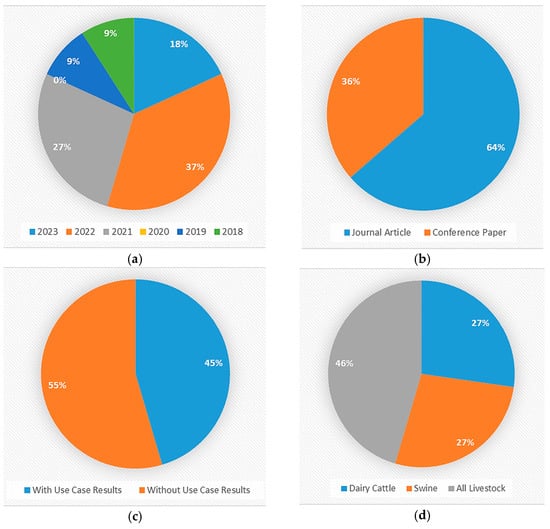 Distribution of the works included in the literature review according to (a) the year of publication, (b) the type of the contribution, (c) the presentation of the use case results, and (d) the animal species of interest.