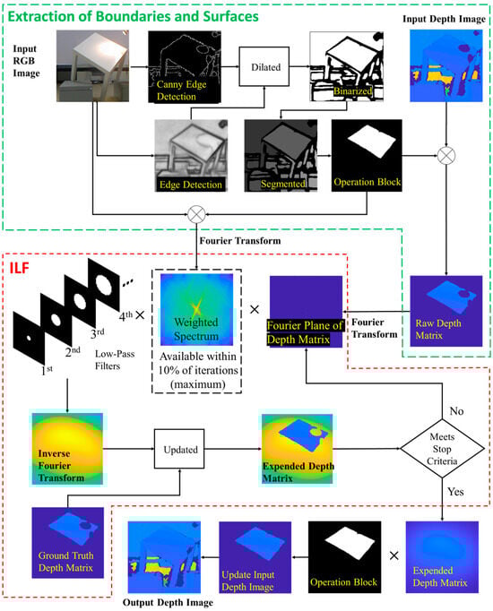 This section provides insight into the functionality of the Iterative Low-Pass Filter (ILF) on a complement of depth images. The design concept aims to integrate features acquired from RGB-D scenes, mitigate noise interference, and generate accurate depth data. To achieve this, we employ an iteratively updated process combined with a dynamically adjustable low-pass filter. The RGB information collaboratively contributes to normalizing spatial frequencies, offering insights into the structure and 3D shape of the surface. Initially, we delineate the recovery surface and extract the spatial frequency of the surface structure from RGB images, utilizing watertight boundaries for precise definition. Following this, we extract the spatial features of the target surfaces from RGB images, expediting the overall process by highlighting surface trends. Figure 1 illustrates the Depth Image Completion Process (DICP), which comprises two integral components: (1) the Extraction of Boundaries and Surfaces (EBS) and (2) the ILF Process.