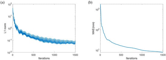 Figure 3a illustrates a notable decrease in the L1 norm during the iteration steps, showcasing the convergence of depth matrices throughout the Iterative Low-Pass Filter (ILF) process. Meanwhile, Figure 3b presents the error between the depth matrix and the ground truth. The results indicate that, during the ILF process, depth matrices converge and are consistently updated with reference to residual data. It is worth noting the presence of several glitches in Figure 3a, which were attributed to the updated low-pass filters.