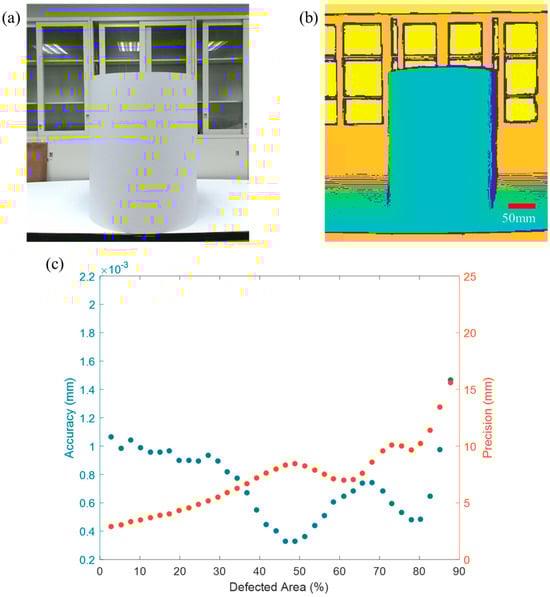 In this section, we assess the maximum continuous defected area and denoising capability of the Depth Image Completion Process (DICP) for a real-scene depth camera. Figure 4 illustrates a real-scene cylinder captured as a raw depth matrix using the Kinect for Xbox One at an observation distance of 1.5 m. The detected depth data inherently carry noise, distributed normally with a standard deviation of 1.5 mm. Subsequently, we systematically removed depth data and applied the DICP. By progressively increasing the continuous defected area along the vertical direction, we created different scenarios. Figure 4c presents the accuracy error and precision error corresponding to various defected areas. Notably, when the defected area constituted 80.22% of the cylinder’s detection area, the precision was 10.28 mm.