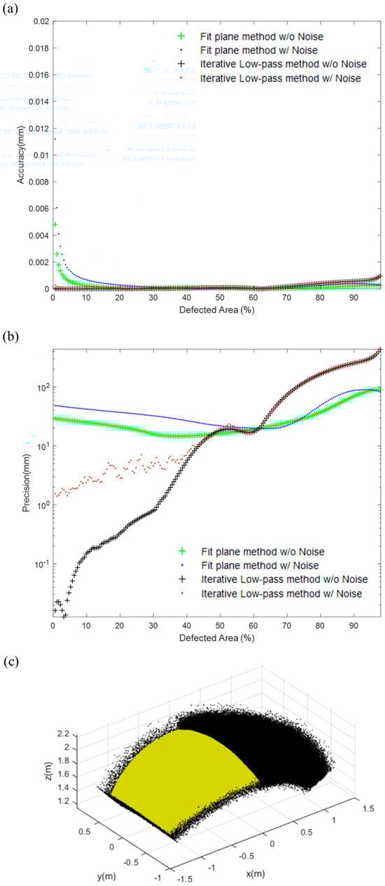 Analysis of a spherical depth image with a 65 mm standard deviation of noise. (a) Accuracy error for the sphere depth image with and without noise. (b) Precision for the sphere depth image with and without noise. (c) Point cloud of a spherical depth image with a 51% defected area and a 65 mm standard deviation of noise.
